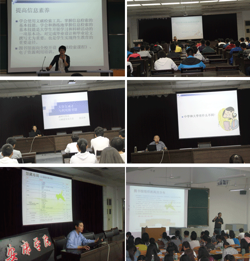 为确保本学年新生入馆教育工作顺利进行,图书馆本学期开始就积极组织,认真筹划:选派馆内业务骨干精心制作《入馆指南》,集体讨论、修改培训课件《大学生成才与利用图书馆》,积极与各系联系安排培训时间;培训开始后,深入各院系,利用同学们的时间,在晚自习开展讲座;培训中利用多媒体课件,通过操作演示,提问互动等方式生动、直观地介绍了图书馆概况、资源分布、开放时间、借阅规则、资源利用、服务概览及丰富多彩的读者活动,希望同学们在大学期间,学会获取知识的有效途径,提高学习能力,做一个优秀读者,鼓励同学们充分利用图书馆资源,在大学里成人成才。培训课后,图书馆还为每位新生读者发放了精美的《入馆指南》,以便新生更直观的了解图书馆的服务,更好的利用好图书馆资源。
