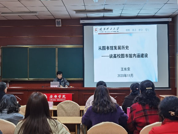 参观结束后,王长安、冯永财和陕西理工大学图书馆采编部主任周卫妮先后为我馆和安康职业技术学院图书馆近50名教师作了题为《从图书馆发展历史—谈高校图书馆内涵建设》《图书馆学术论文写作:困境与突破》《文献编目—浩瀚信息有序化》的学术报告。几位专家分别围绕图书馆发展历史、内涵建设、图书编目工作、科学研究工作等方面,结合业务工作实例和研究成果,深入浅出地奉献了三场精彩报告,为在座图书馆人准确把握新时代图书馆发展趋势,加强资源建设、智慧化建设,开展富有针对性、特色性工作,增强管理服务能力,提升科研水平和文献建设质量提供了重要启示和工作思路。